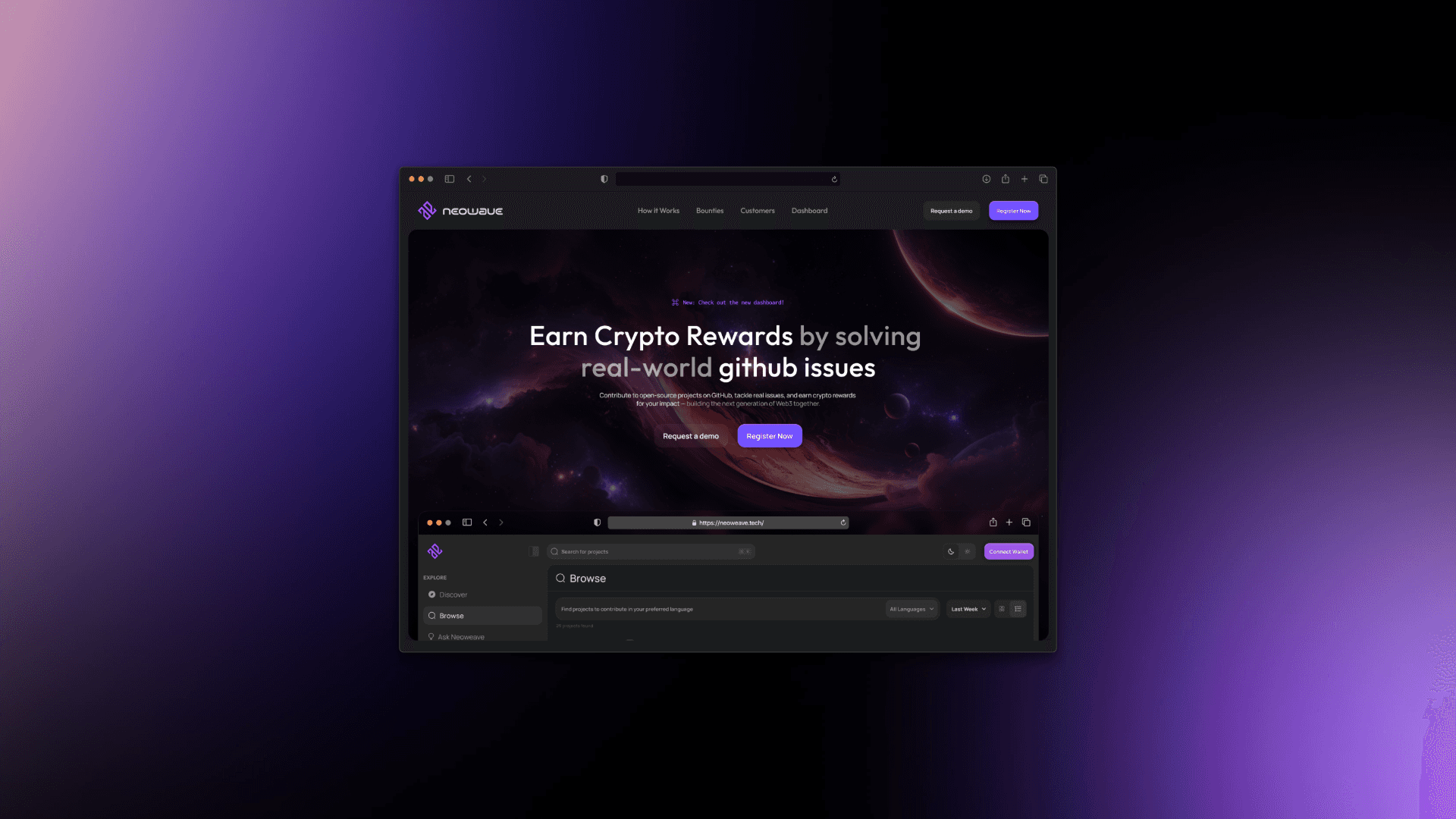 Designed the NeoWeave's landing page for a Web3 platform that rewards developers with crypto for solving GitHub issues.