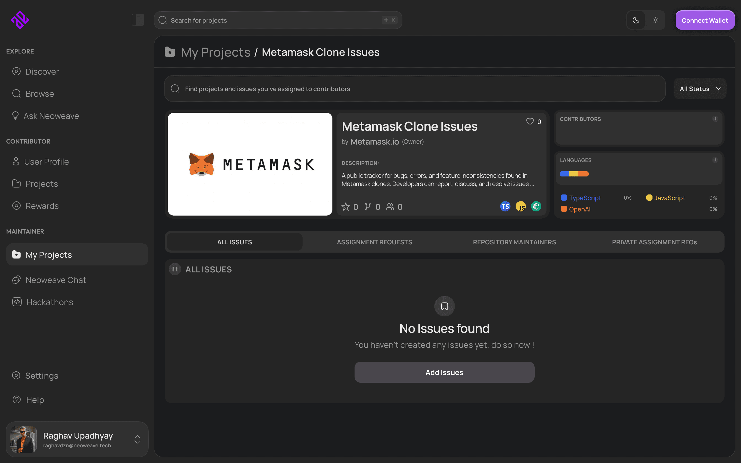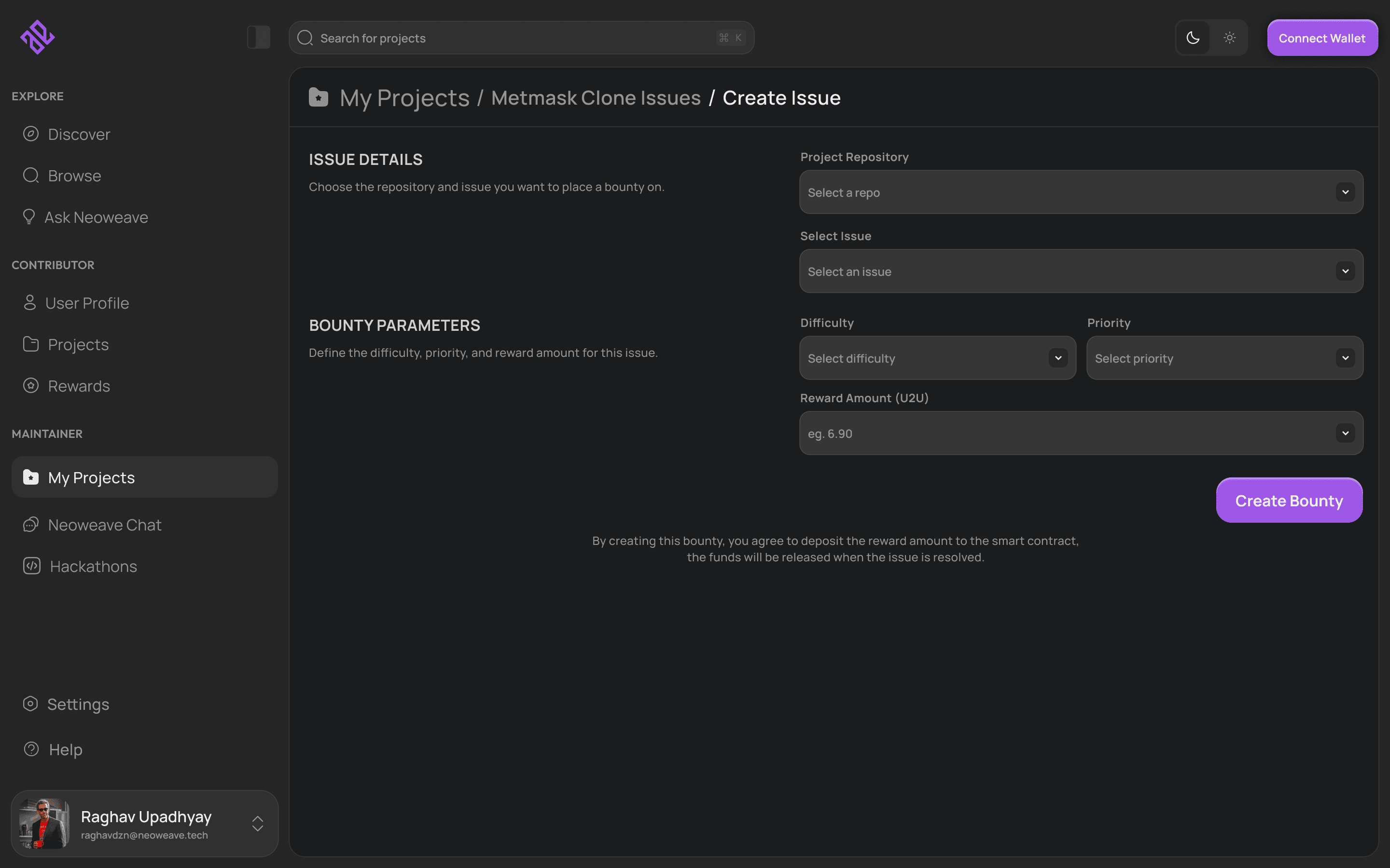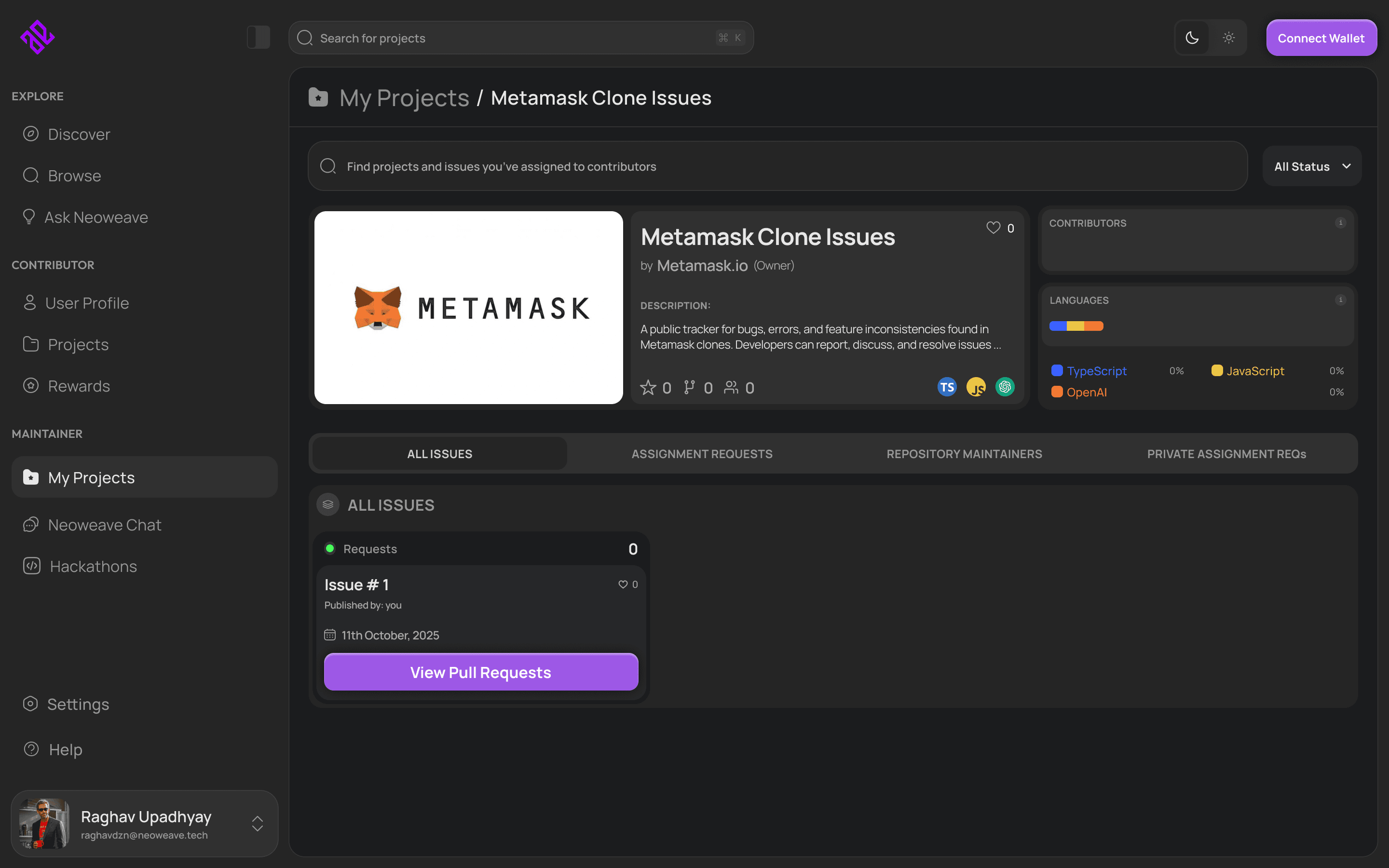 Create, manage, and track all maintainer-owned repositories, issues, and active bounties in one place.