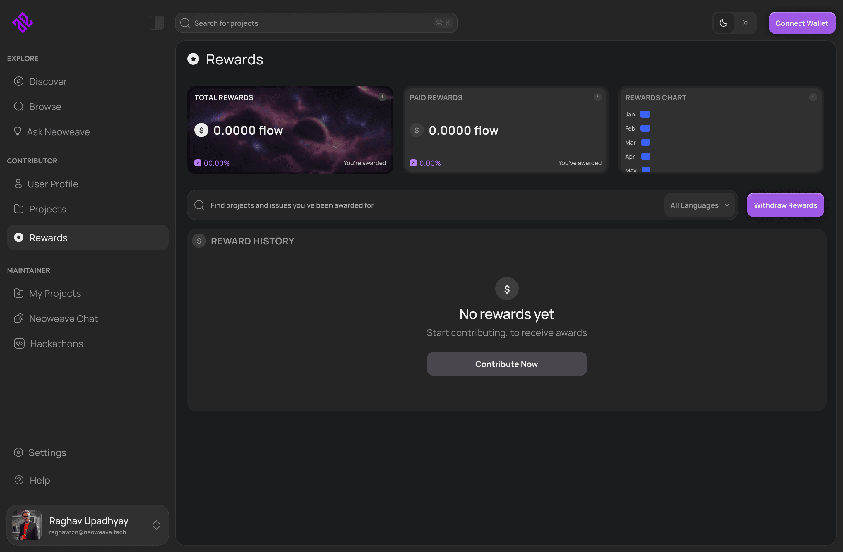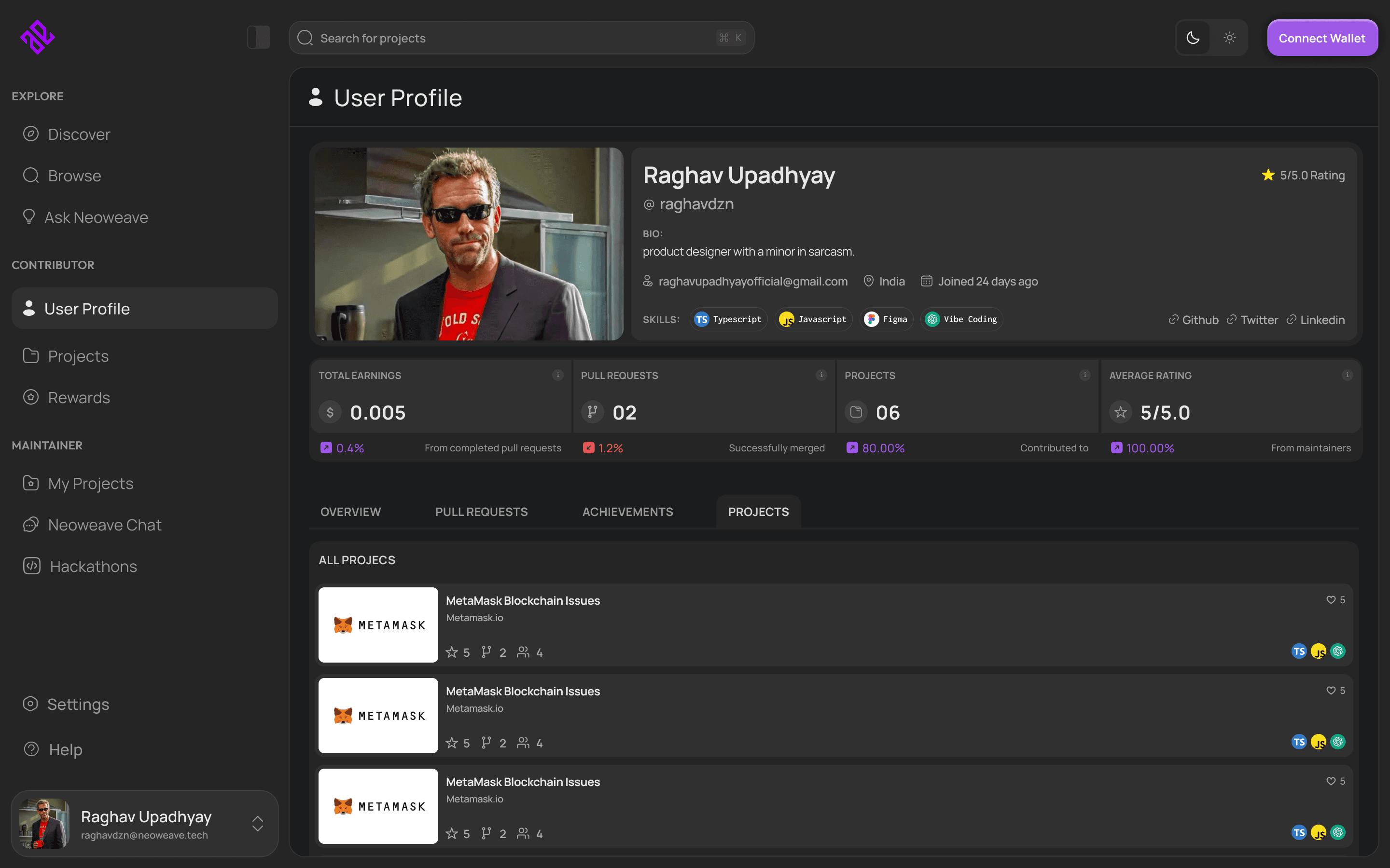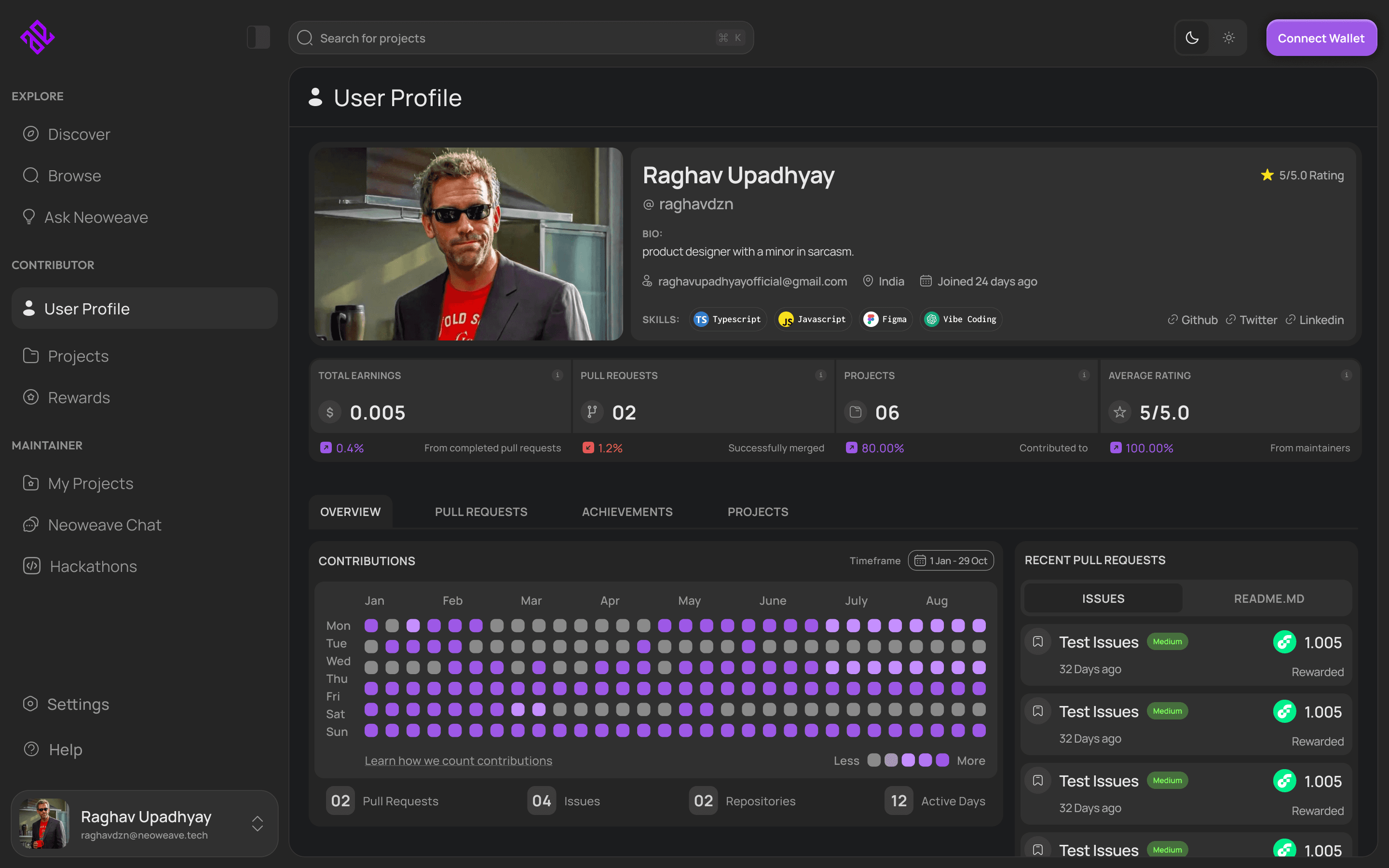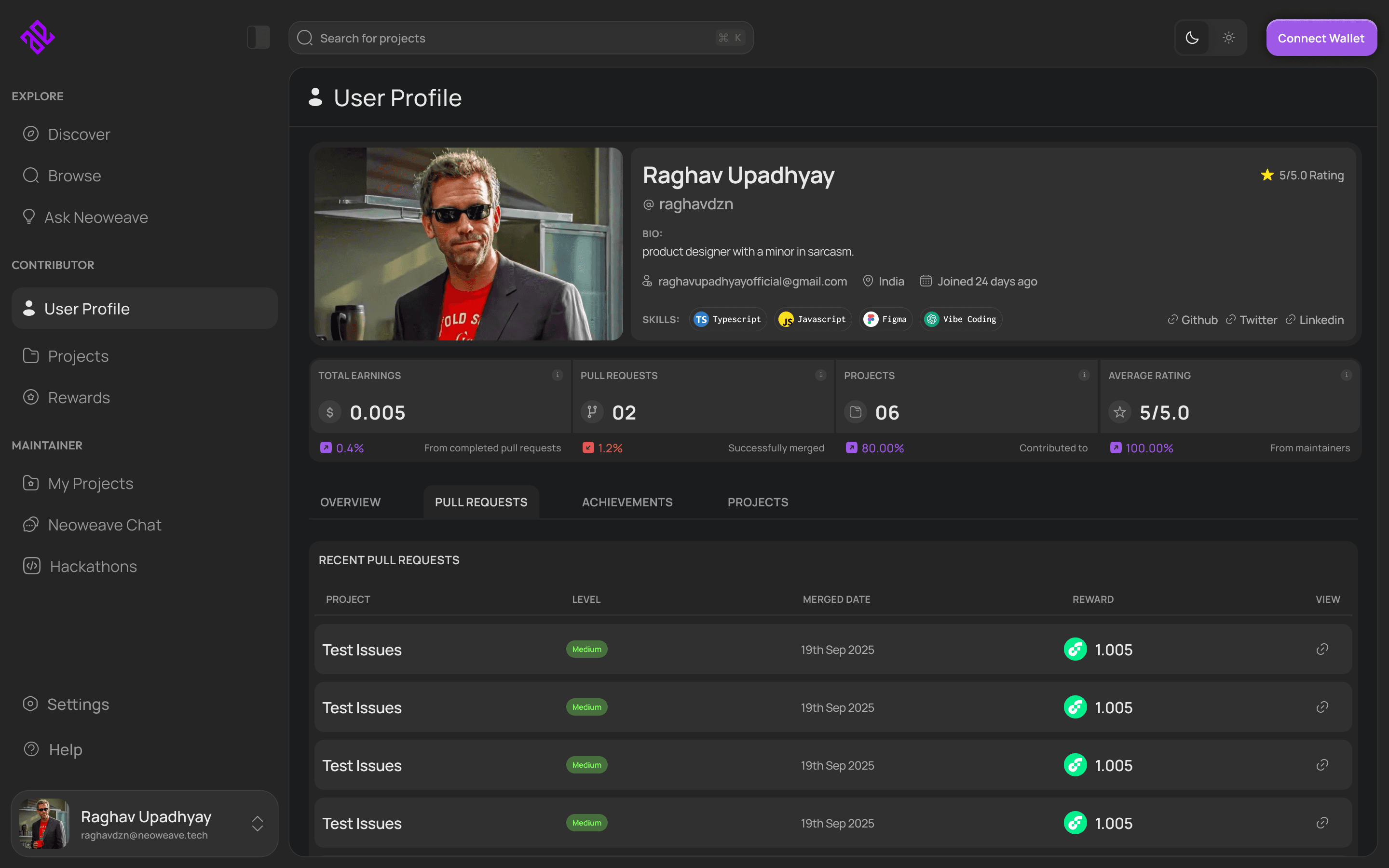 View your activity, pull requests, achievements, and on-chain earnings in one place.