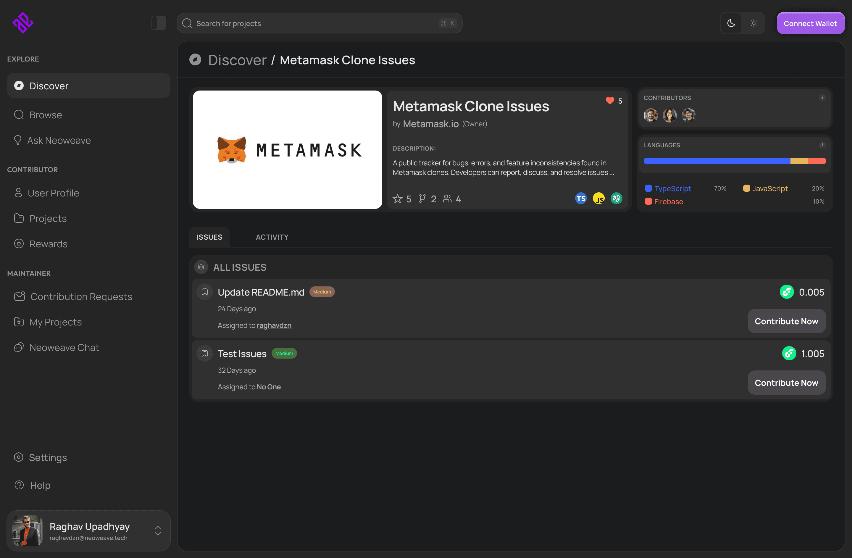 Manage active and completed contributions, track issue status, and monitor progress.