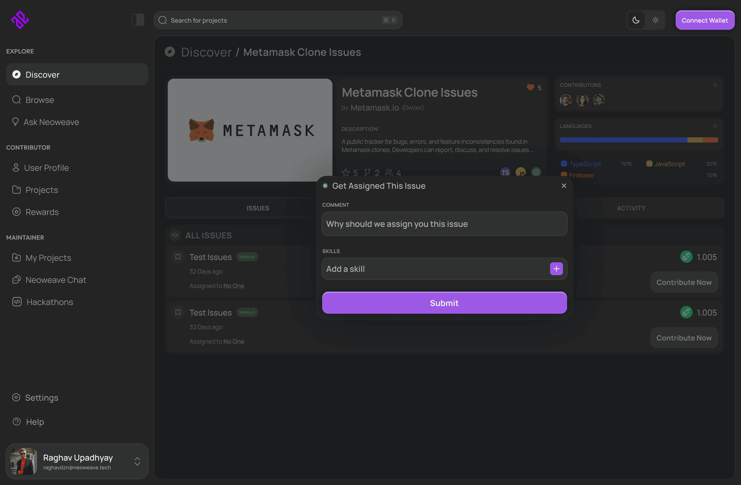 Explore projects and issues through structured categories, filters, and tech stacks, making it easy to discover work aligned with your skills.