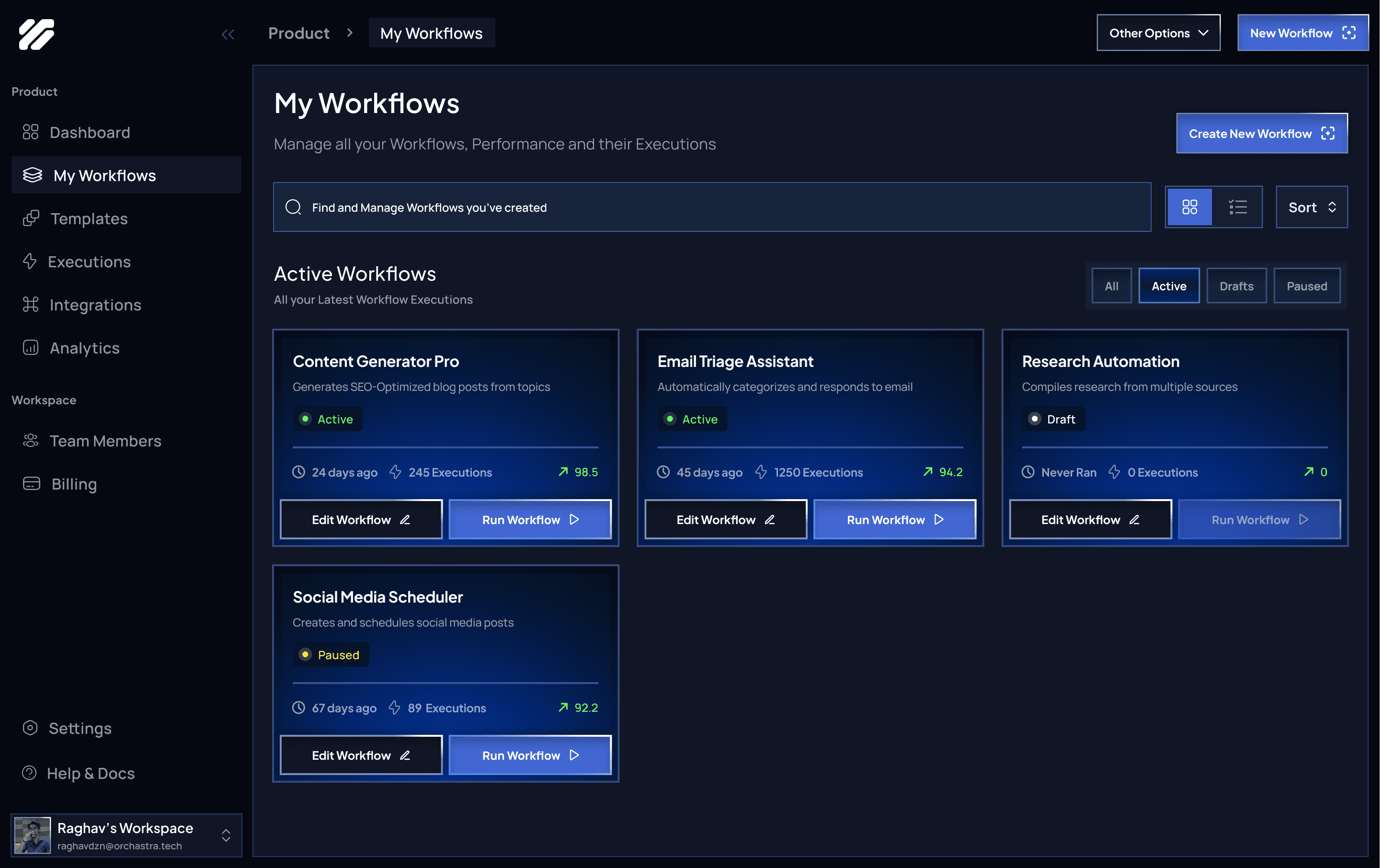 View all running, paused, and draft workflows with clear status indicators and quick actions.